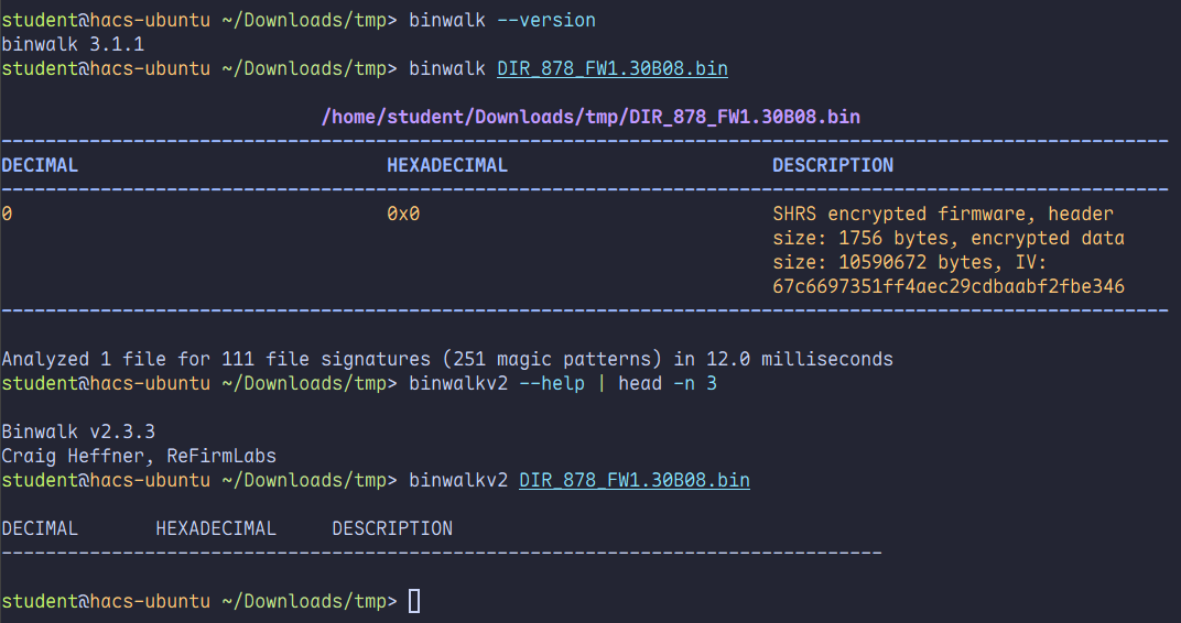 For those who are not using the class Ubuntu VM to do the homework, you may run into an issue where binwalk doesn’t recognize the encrypted firmware file. This seems to be an issue with older versions of binwalk. However once you decrypt the firmware, older versions of binwalk should be fine.