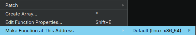 endbr64instruction and press thePkeyboard shortcut, or right click and selectMake Function At This Address > Defaultto create a new function.