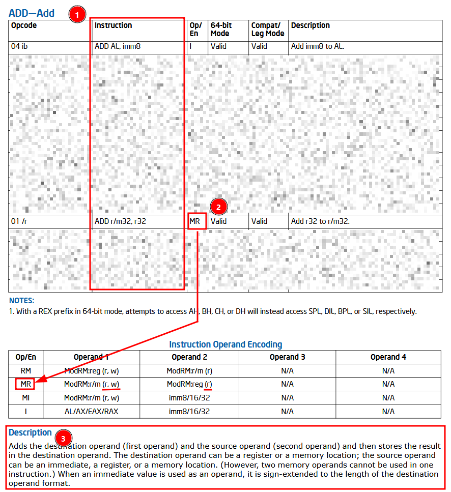 Instructioncolumn shows the various different formats that the add instruction can take. In the two rows not blurred out we can see:ADD AL, imm8ADD r/m32, r32