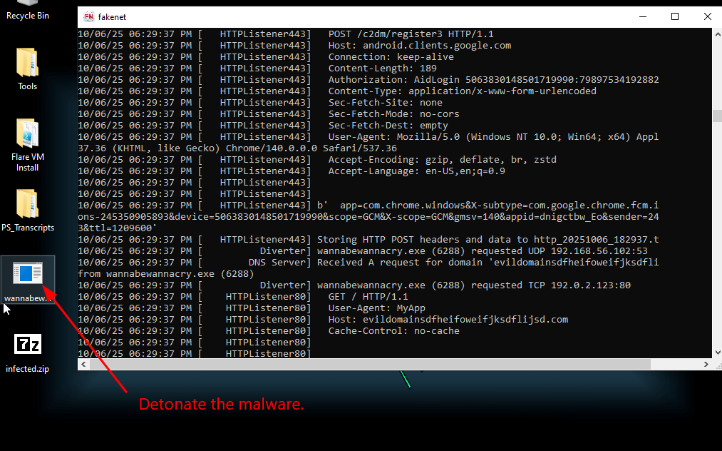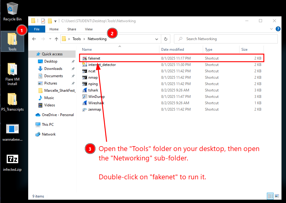 First run the fakenet program found in the Tools folder on your Desktop.