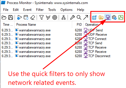 Procmon has some buttons in the top ribbon that you can use to quickly filter for specific types of events: