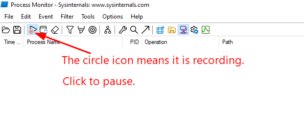 When you open it, you should start seeing events immediately. Pause the capture so we can filter events to the specific program we care about.