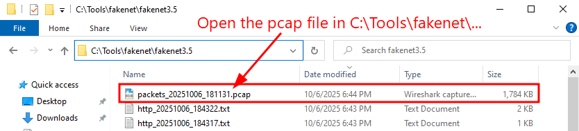 Then, open the PCAP located in the fakenet directory in C:\Tools\.