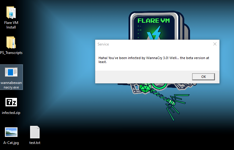 Create a text file on the Desktop to use as a test to see if the malware encrypts it. You can use whatever method you want but here is an example in Windows PowerShell: