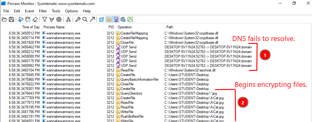 echo "Hello, world!" | Out-File ~/Desktop/test.txtThen clear all the events in procmon and detonate the malware again.