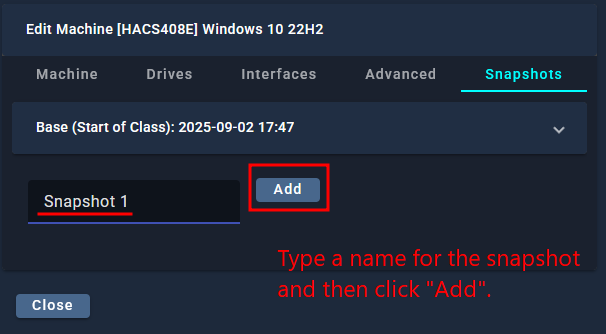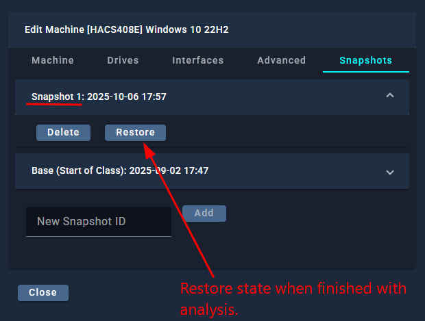 Being able to revert back to a clean state is extremely useful when analyzing malware. This is one of the many reasons to always use a VM when reversing malicious programs. In this walkthrough, you will learn how to create a VM snapshot on the class lab infrastructure.
