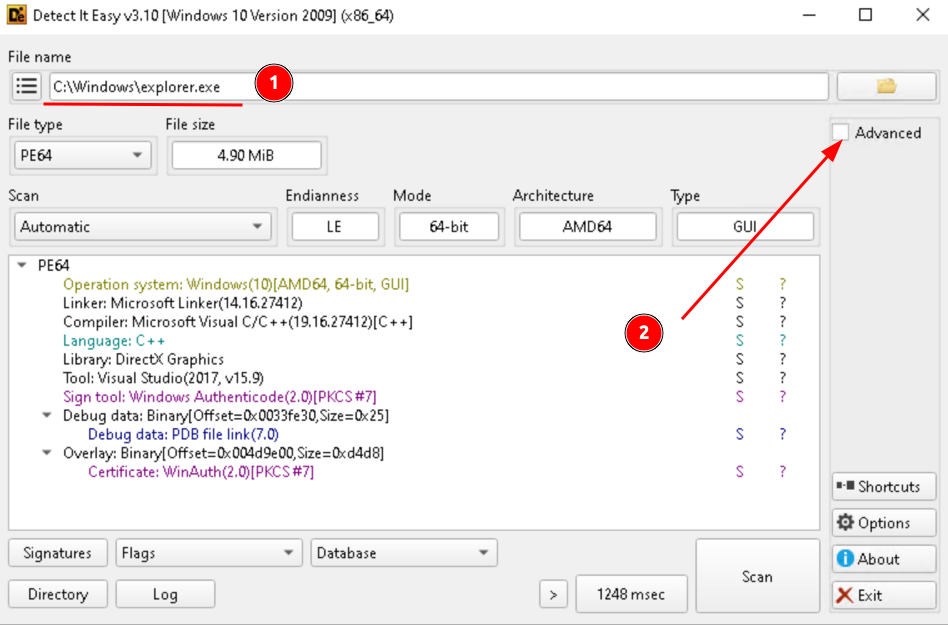 Detect it Easy (die) is a popular tool to analyze Windows portable executable
