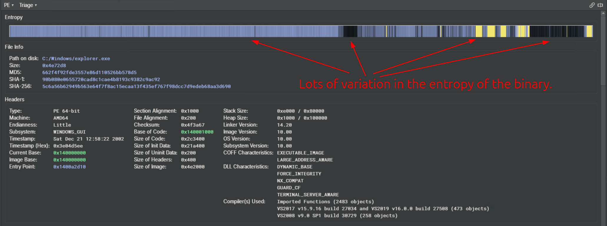 Review the entropy graph in Binary Ninja. Explain how it is different fromexplorer.exe.