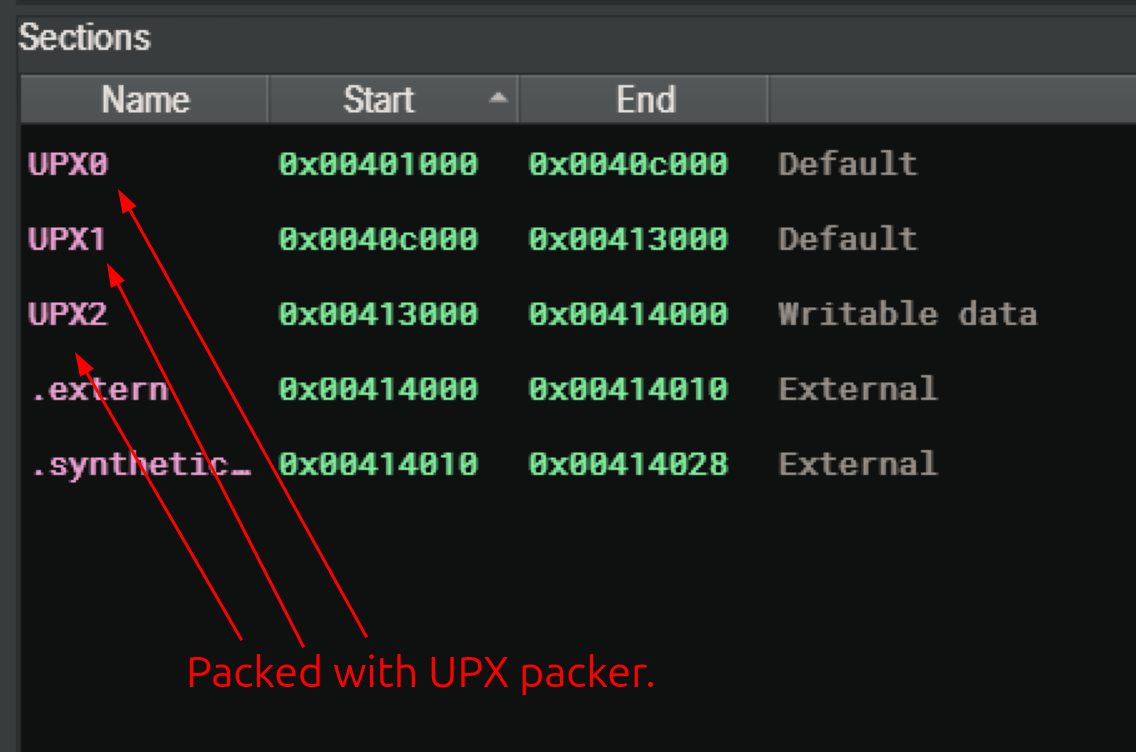 Your last challenge is to try and unpack this program. Googling strings or section names is a good way to figure out what packer was used. Detect it Easy certainly has some helpful information as well.