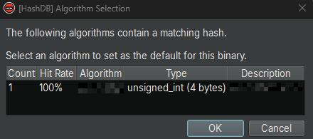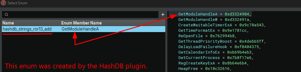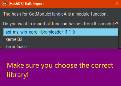 Hash Lookupwhich will lookup the function names using the algorithm you selected in the previous step to create anenumentry with hash values mapping to function names for a specific library. Make sure you select the correct one in the drop-down menu!