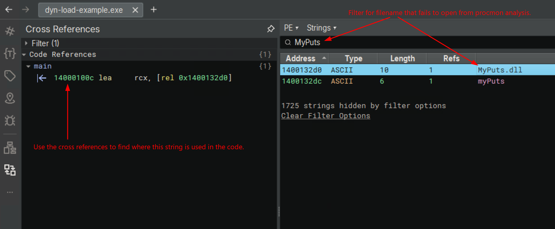 Use the strings view to find the name of the file and then follow the cross reference to see where this string is used. Review the code that is doing the dynamic loading and explain what functions are used.