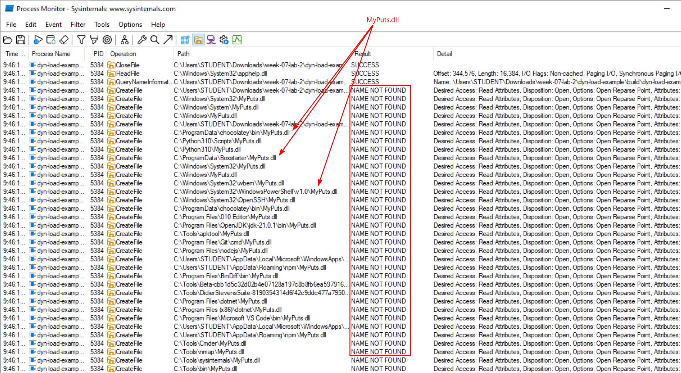 You should see it try and fail to open a .dll file a lot of times. Look for