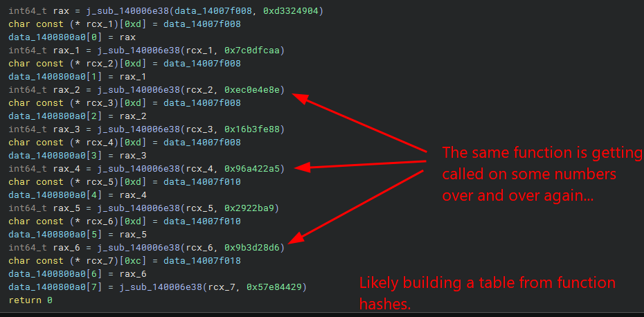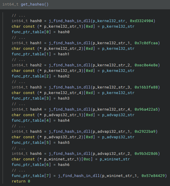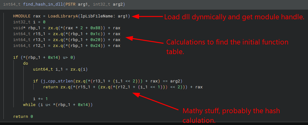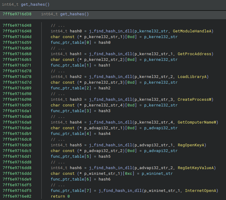 This program uses a malware technique known as function hashing or API hashing in order to hide the names of the library functions that are called. This makes it harder for reverse engineers to figure out what a program is doing. Reverse the program in Binary Ninja to answer the following questions: