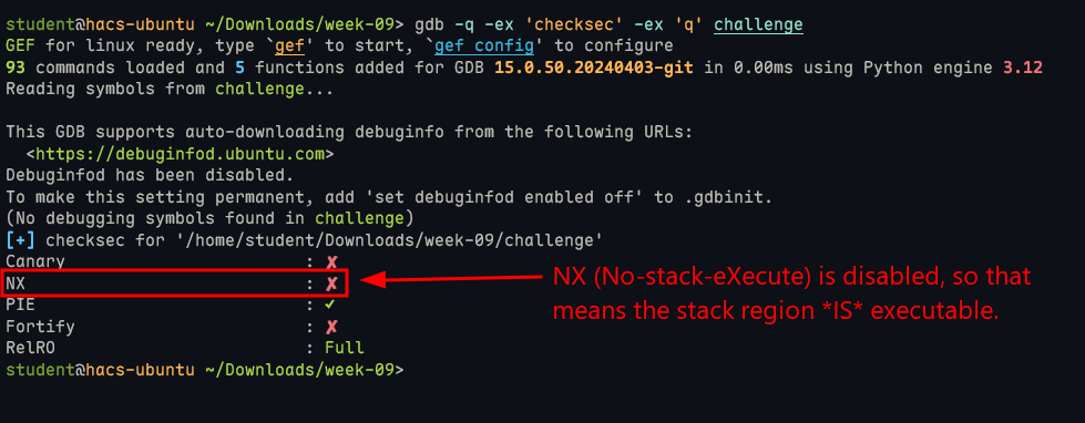 Explain what each of the security checks mean. Does the stack region for this program have execute permissions enabled?